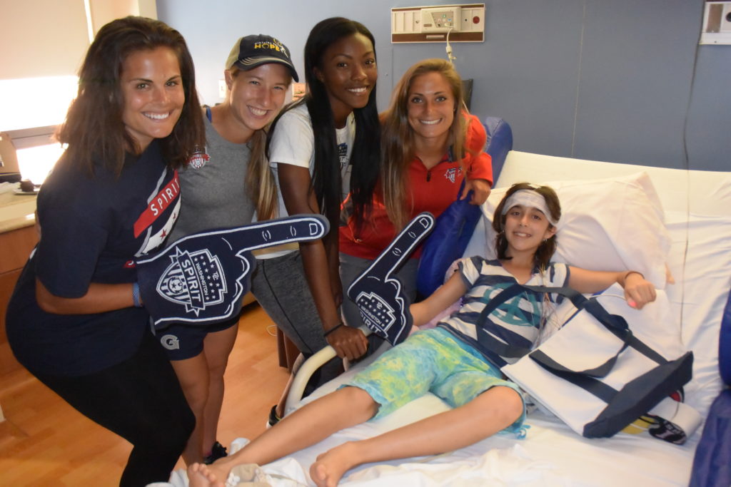 Members of the Washington Spirit spent over two hours connecting with patients at the MedStar Georgetown University Hospital in Washington D.C. on May 19th. Thanks to the efforts of our incredible partner Hope for Henry, players were able to spread some cheer by handing out t-shirts, delicious cupcakes and colorful balloons.