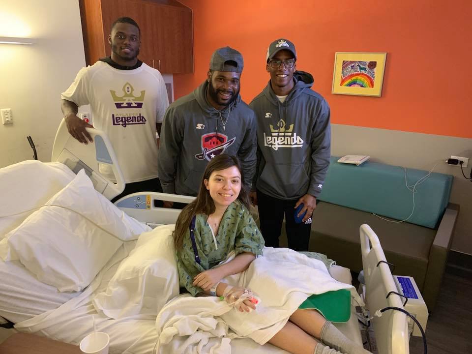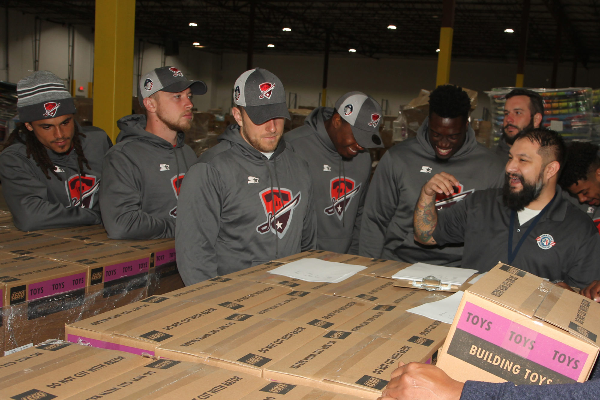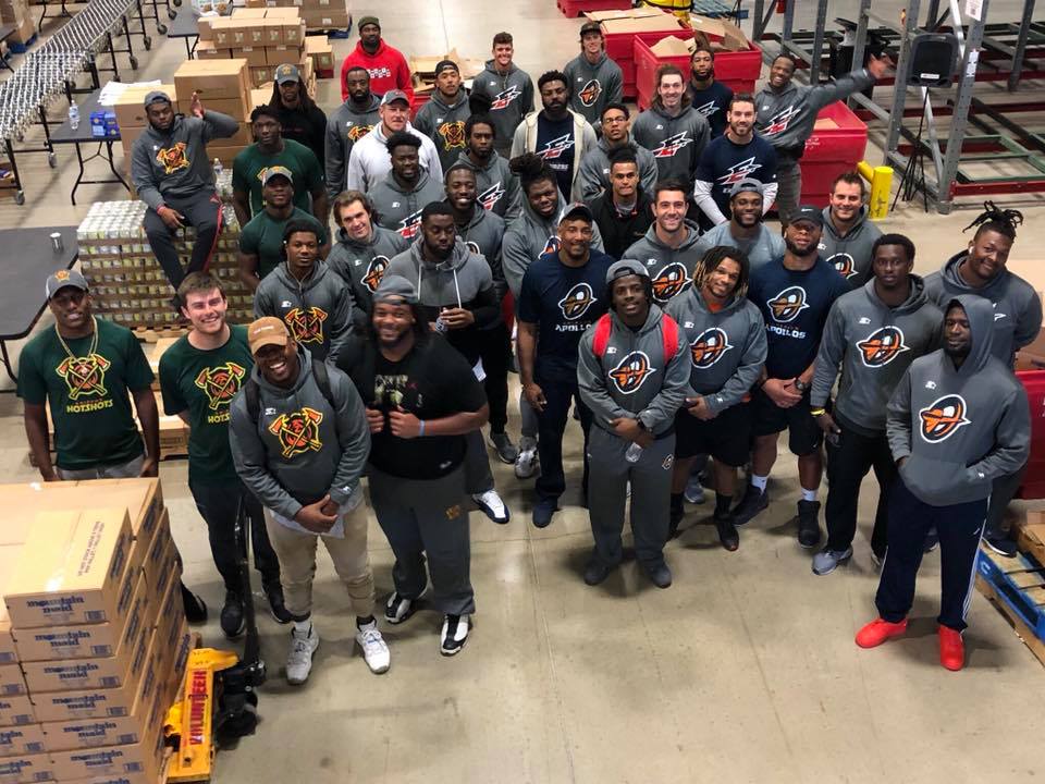 The week after we presented the teams, we connected teams to local San Antonio based organizations over a 3-day period. Friday, the Atlanta Legends and San Antonio and Hines Ward, Head of AAF Player Development, participated in a Starlight Children’s Foundation visit at University Children’s Health Hospital and members of the San Diego Fleet took part in an Active School visit at Walker Elementary School. Saturday, players from the Salt Lake Stallions went to the Ronald McDonald House to work on beautification of the property and San Antonio Commanders went pack toys for kids of military families for Operation Homefront. Sunday, players from the Orlando Apollos, Memphis Express and Arizona Hot Shots spent the afternoon building food boxes for needy senior citizens at the San Antonio Food Bank.