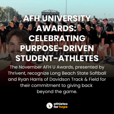 At Athletes for Hope, we believe that true leadership starts with service. Every month, the AFH University Awards, presented by Thrivent, recognize student-athletes who go above and beyond — using…